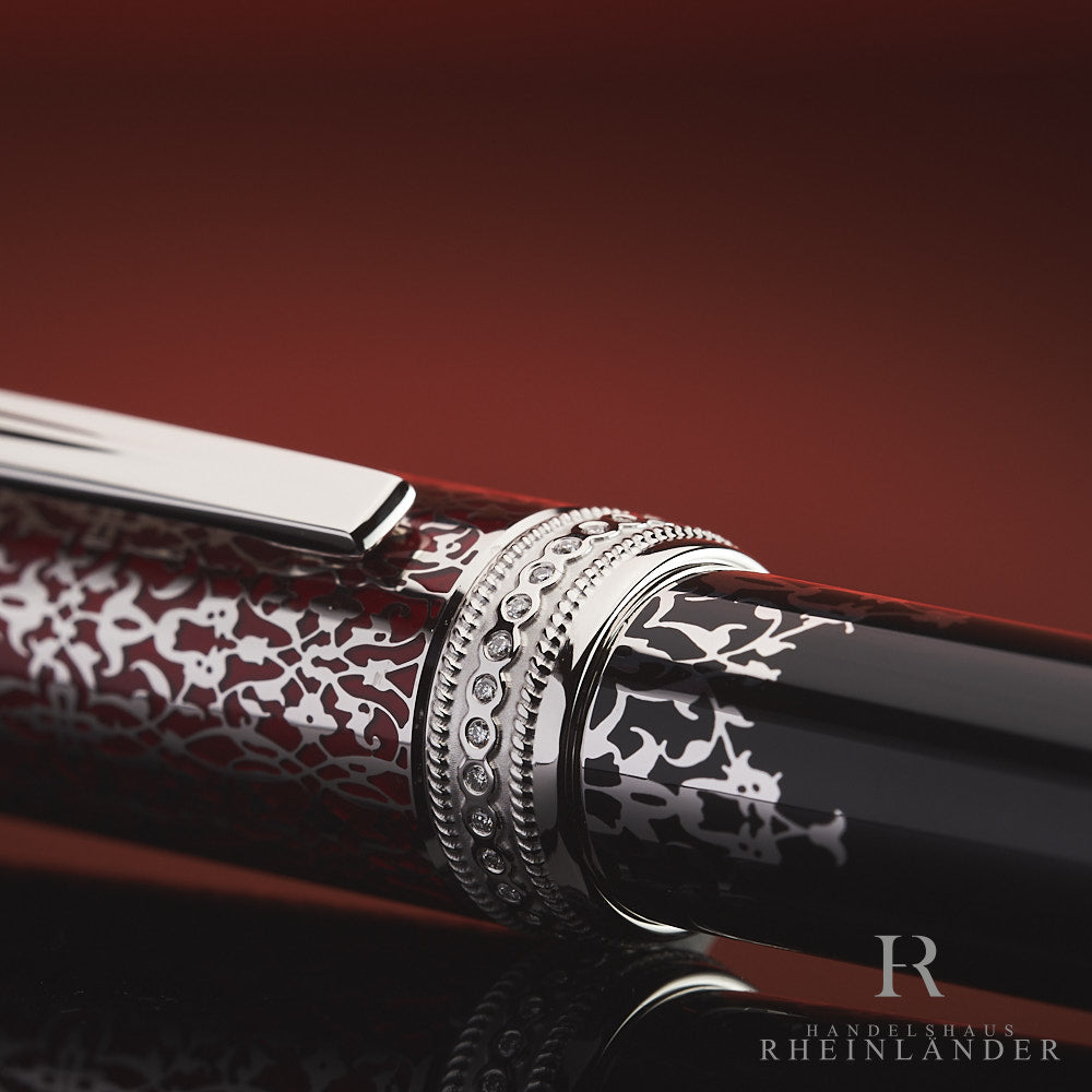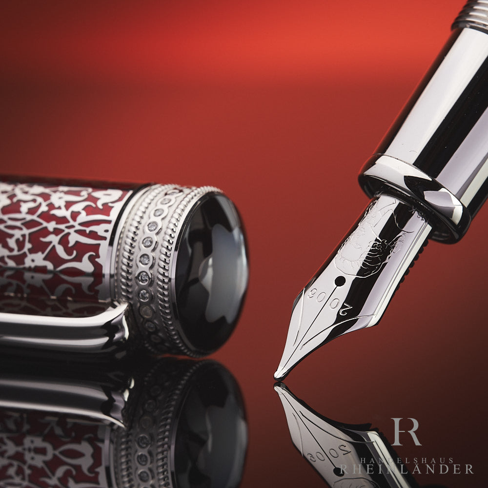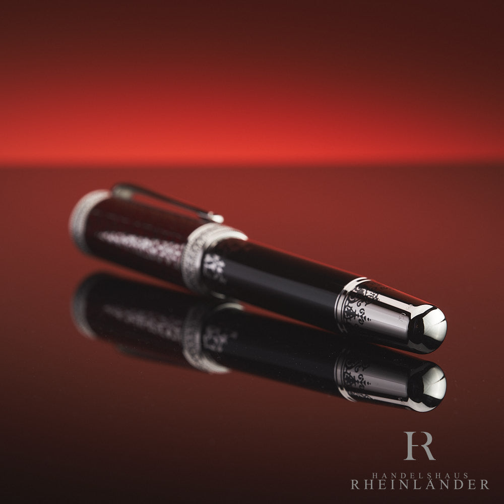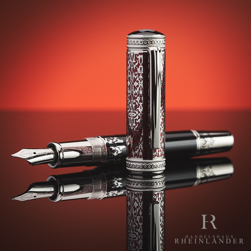 Schwarzer Montblanc Füller mit aufwendigen Details liegt auf Mozart-Editionsbox, nah von oben vor rotem Hintergrund fotografiert
