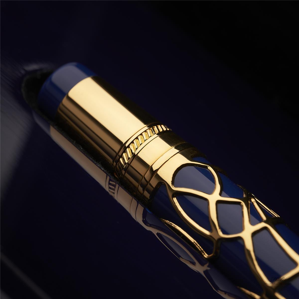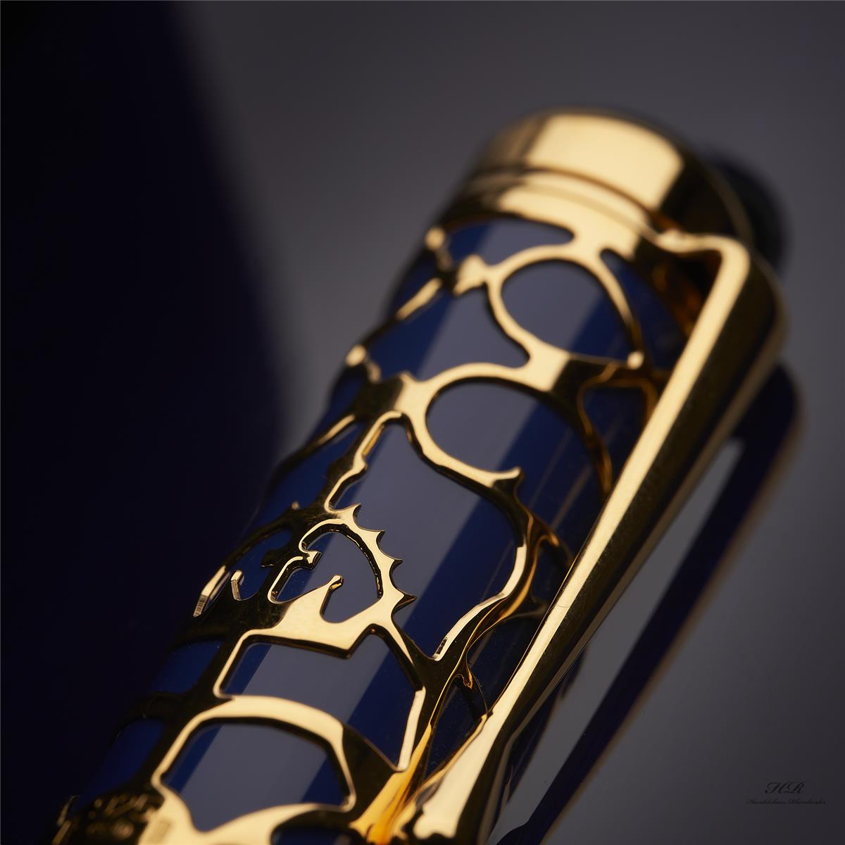 • Material: Korpus & Kappe aus blauem Edelharz | Geflecht aus vergoldetem 925er Sterlingsilber