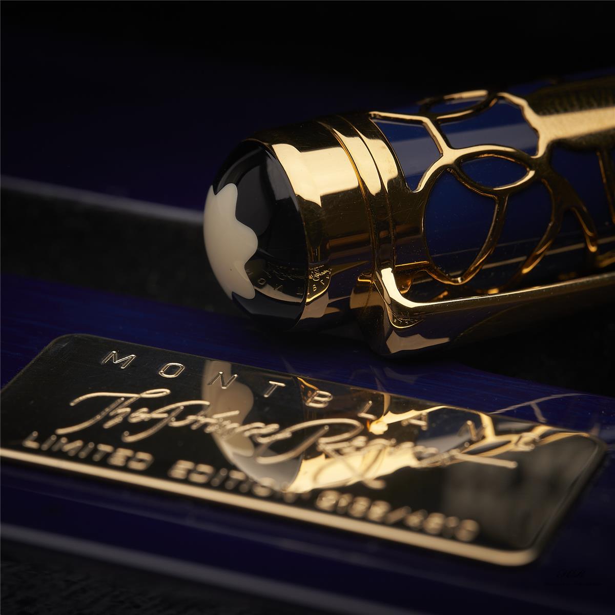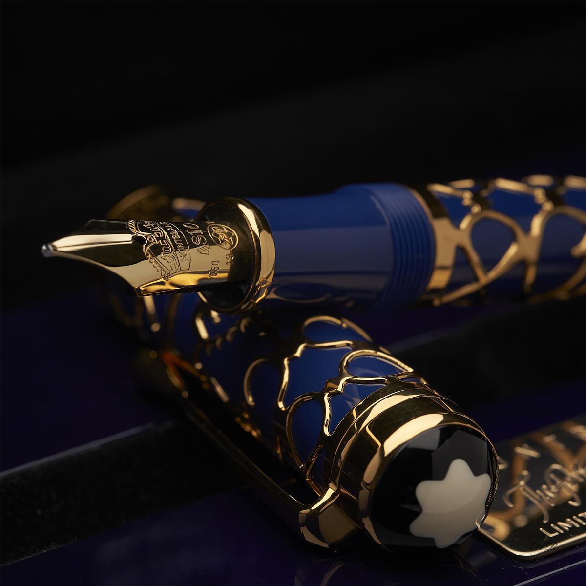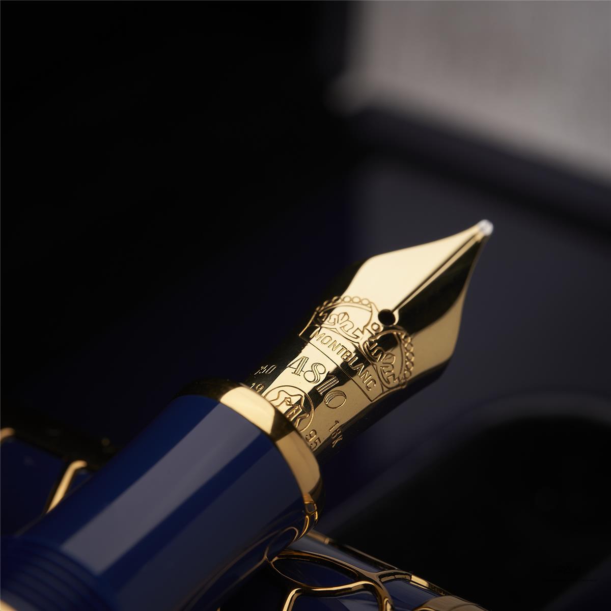 Blau-goldener Füller liegt in offener, blau lackierter Originalbox, von seitlich oben nah fotografiert