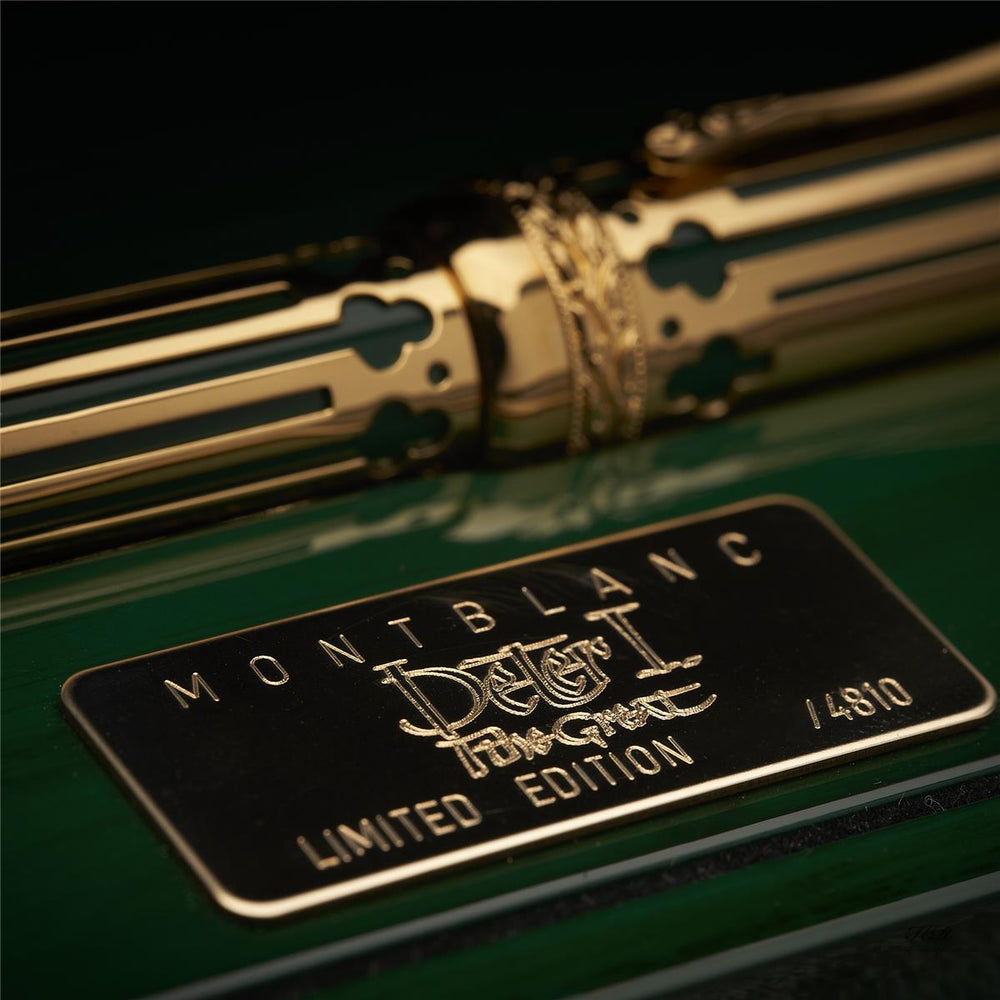 Perlweiß lackierter Korpus, Kappe in minzgrünem, transluzentem Lack über viktorianischem Muster, signaturvergoldete Beschläge. Clip als Anspielung auf das königliche Zepter, grüner Synthetikstein als Verweis auf den Verlobungsring. Krone als Inspiration des Kappenkopfes mit Emblem aus weißem Edelharz. Kappenring mit „I will be good“. Die handgefertigte Feder aus 750er Massivgold trägt eine geprägte Rose. Maße etwa 145,3 mm Länge, 18,5 mm Durchmesser, ca. 106 g.
