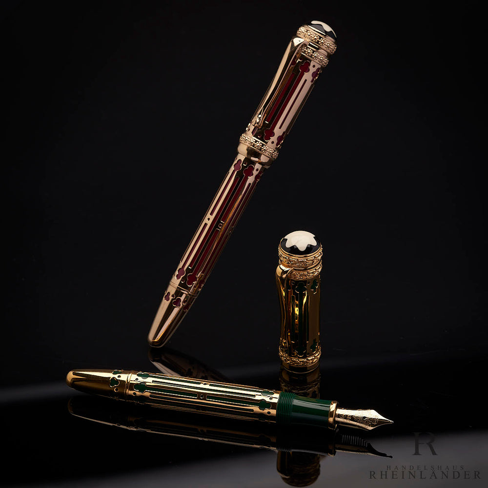 Patron of Art Modelle kombinieren guillochierte Strukturen, transluzente Lacke, vergoldete oder platinierte Beschläge und das ikonische Emblem aus weißem Edelharz. Architektur, Wappen und Zitate der geehrten Persönlichkeit fließen in Clip, Kappe, Korpus und Feder ein. So entsteht ein Füllhalter, der Geschichte und Design spürbar macht.