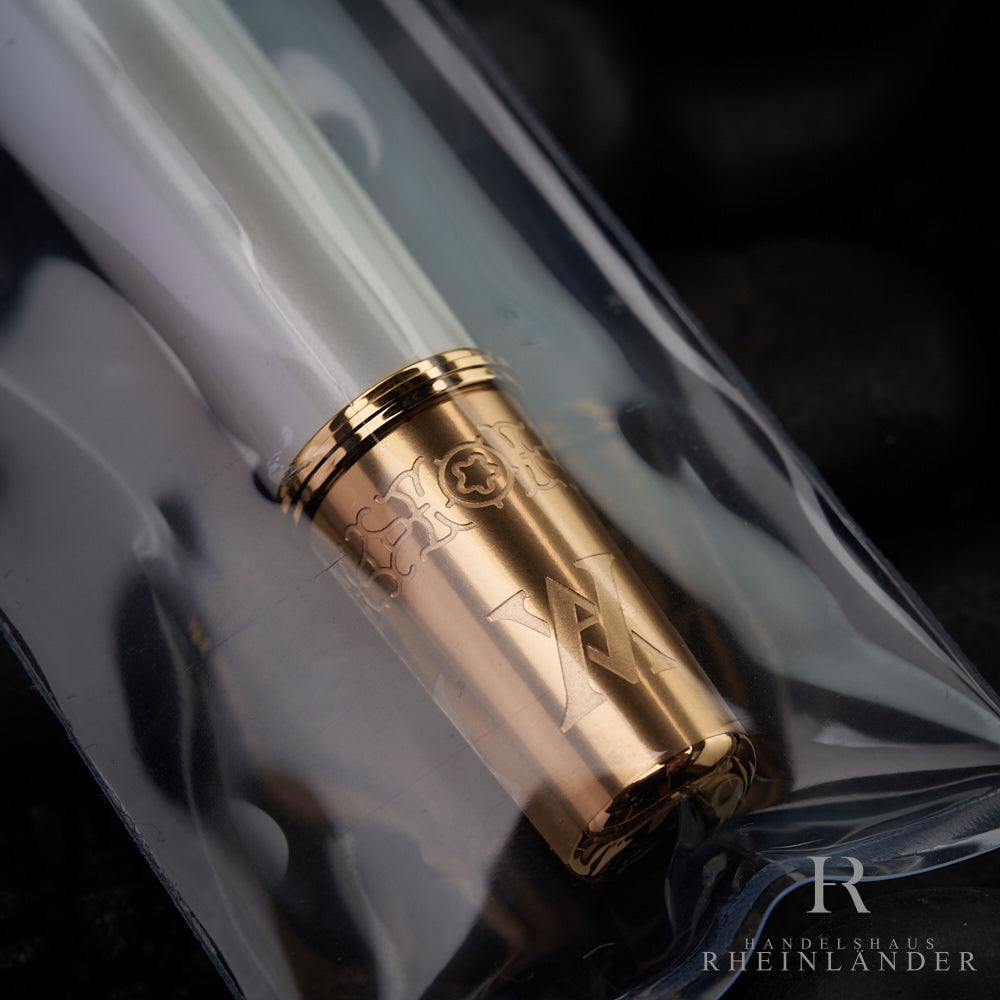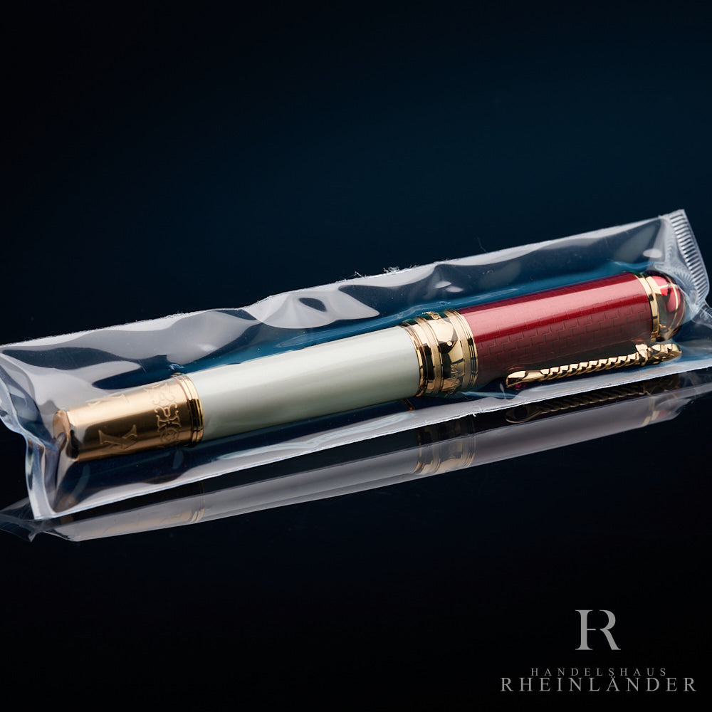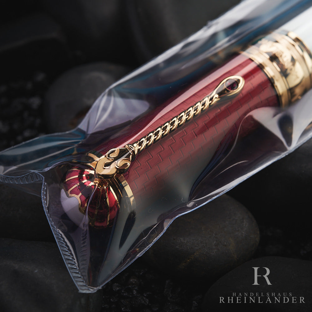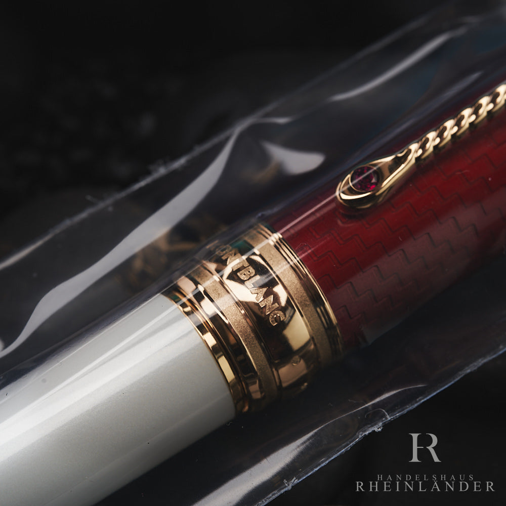 Die Homage an Prinz Albert ist ein Teil der Paar-Edition aus der Patron of Art Serie 2022. Der Füllfederhalter ist in weiß und rot gehalten und verziert mit Mustern des Königshauses. Als besonderes Detail ziert die Feder das Wappen Sachsens und erinnert damit an die Herkunft von Prinz Albert.