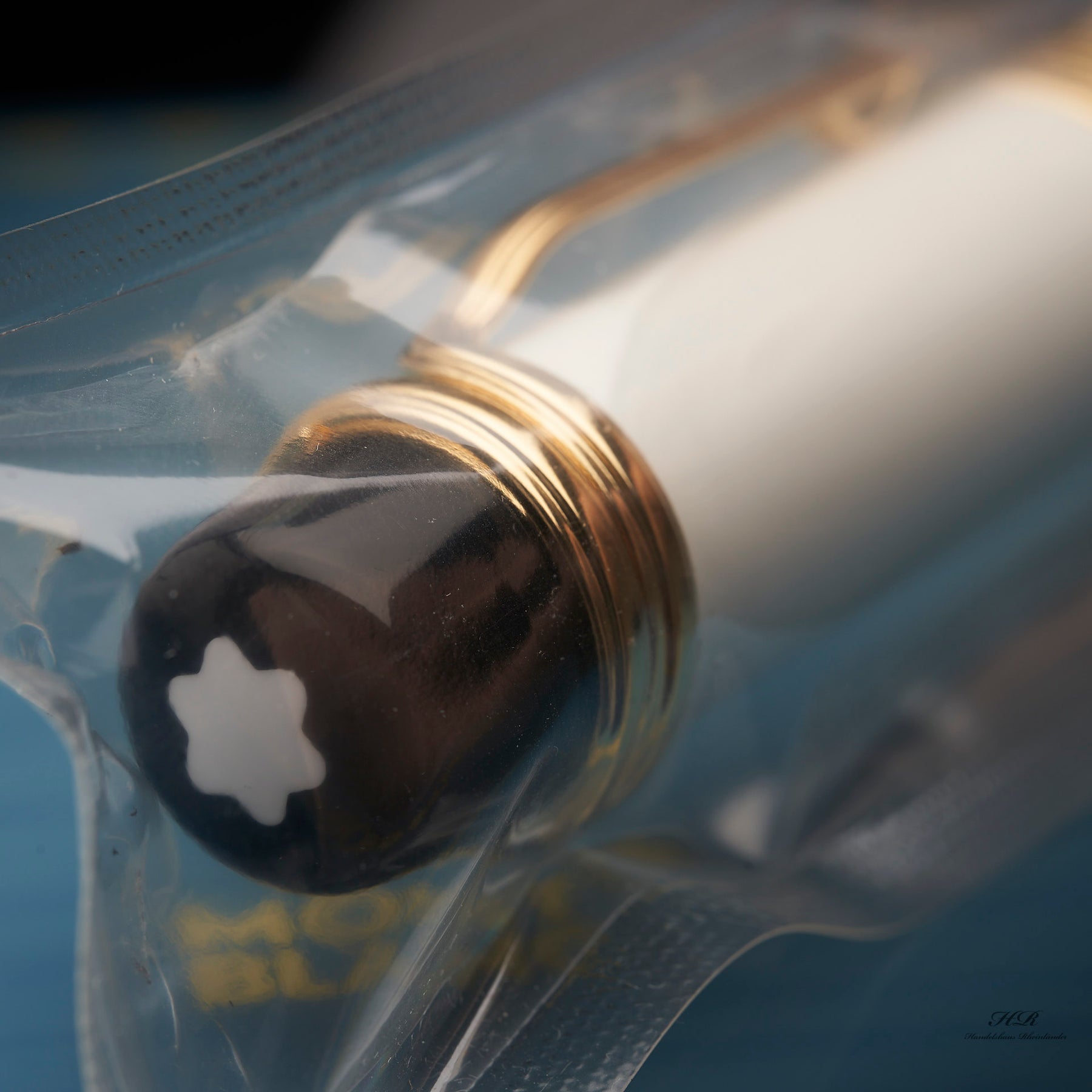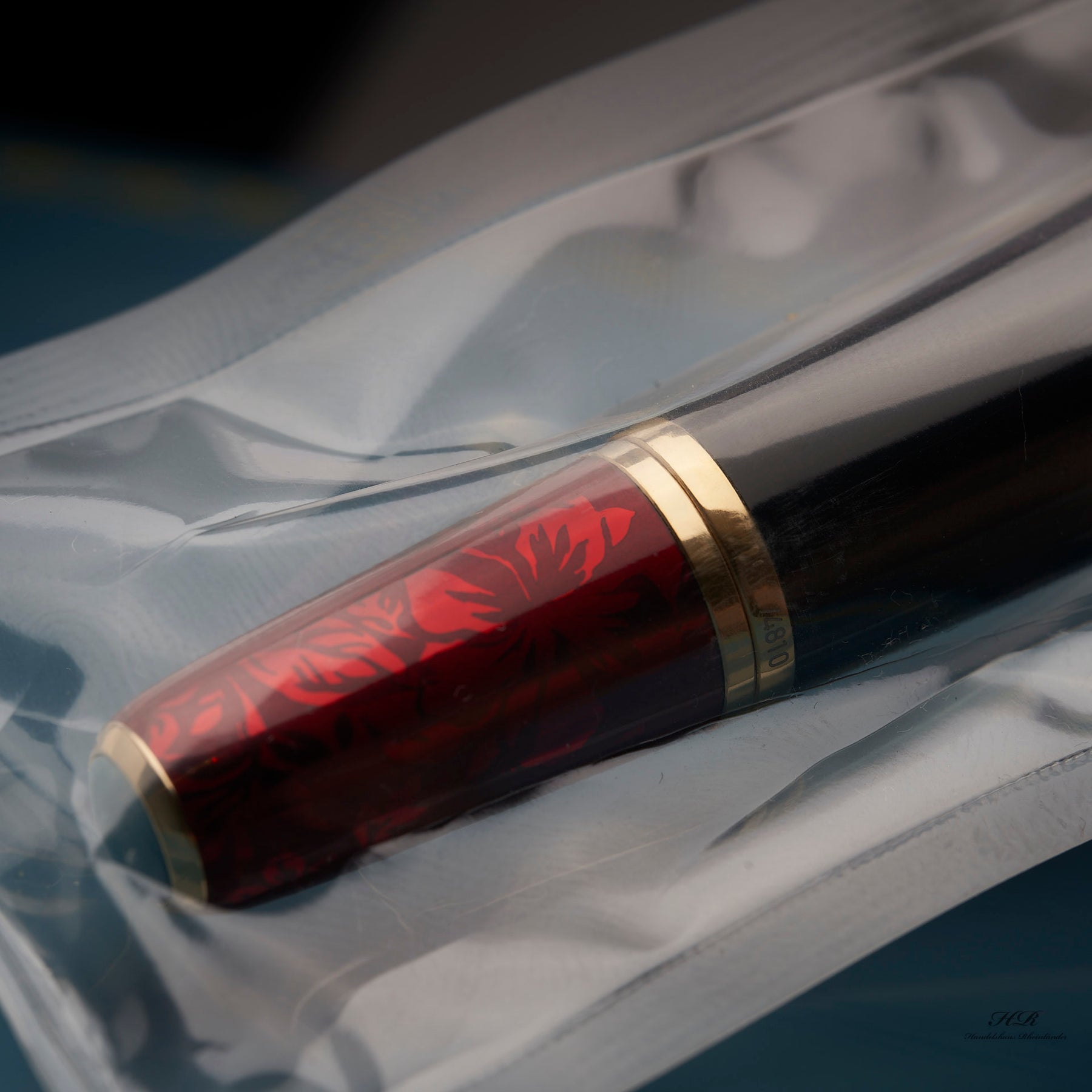 Füller in transparenter Schutzhülle liegt in offener, außen blau lackierter Originalbox vor grauem Holzoptik-Hintergrund