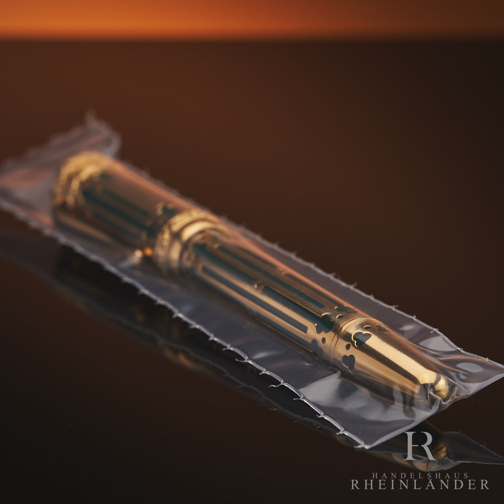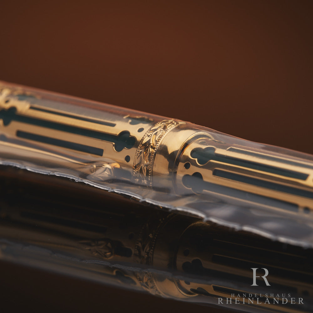 - Material: Kappe & Korpus aus dunkelgrünem Edelharz | Gelbgold vergoldete Ornamente