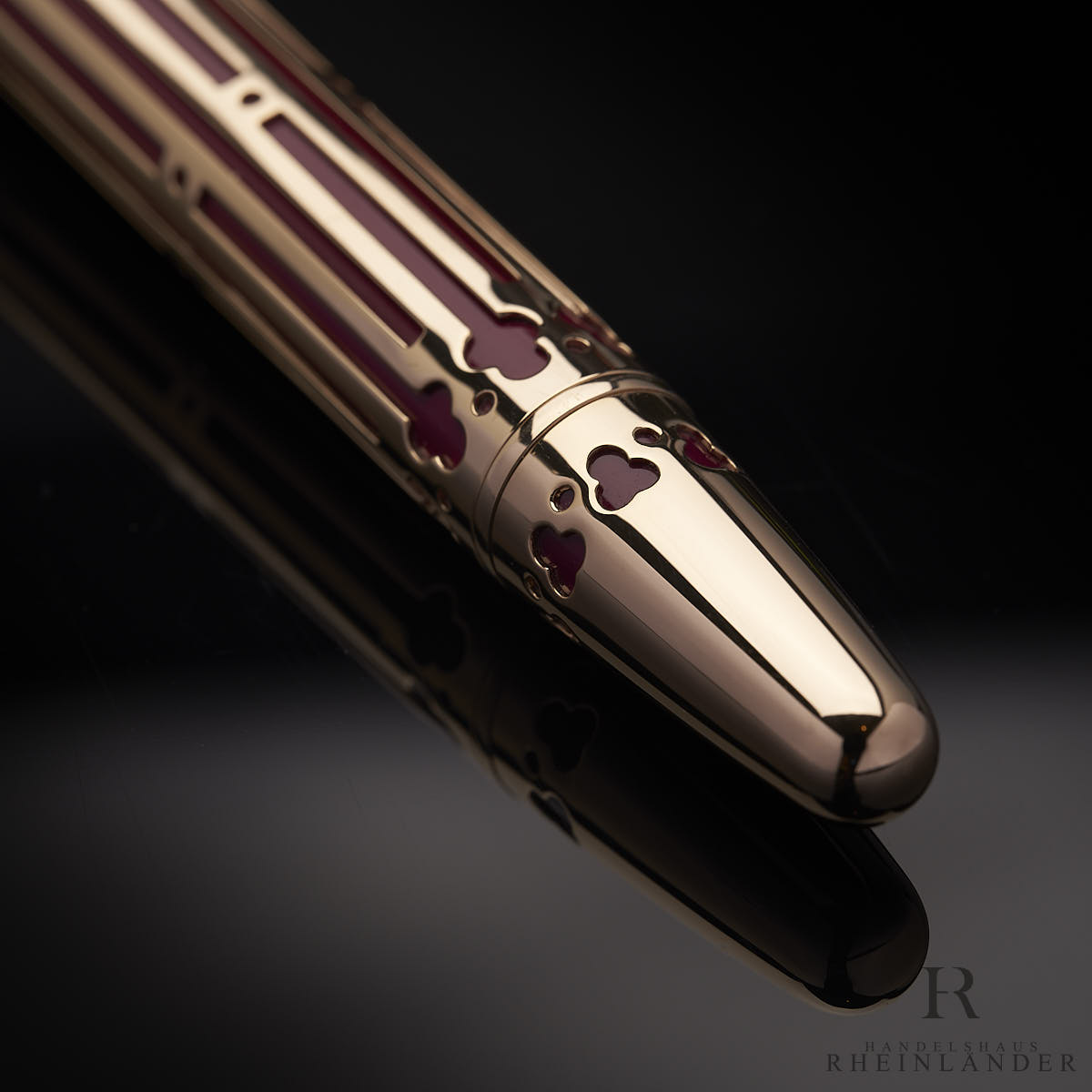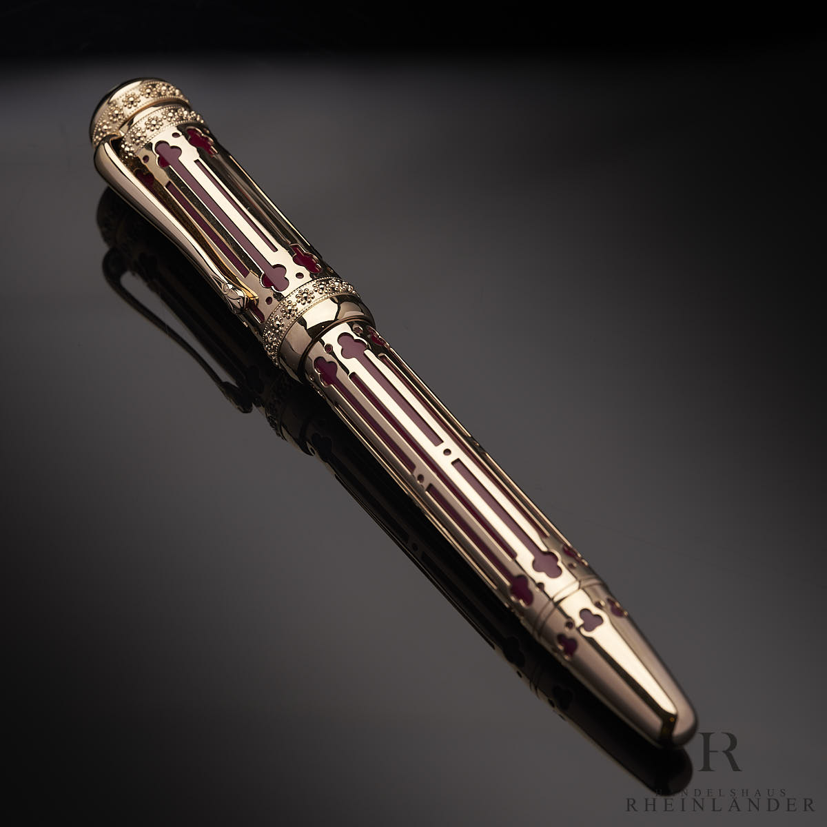 Goldener Füller liegt in offener, rot lackierter Originalbox vor dunkelgrauem Hintergrund