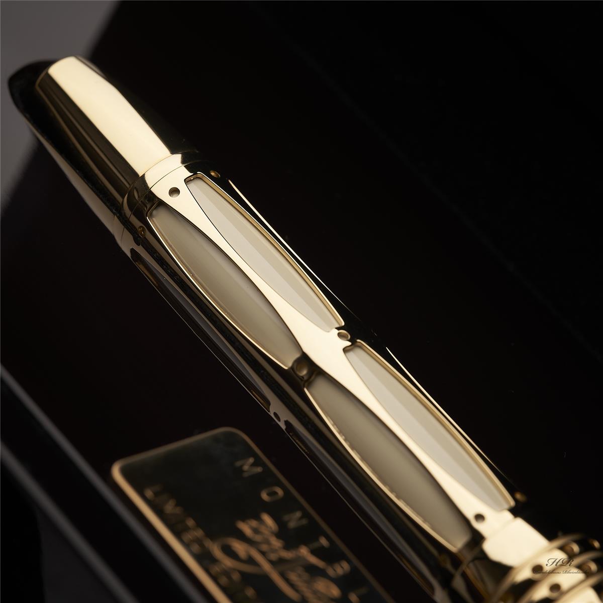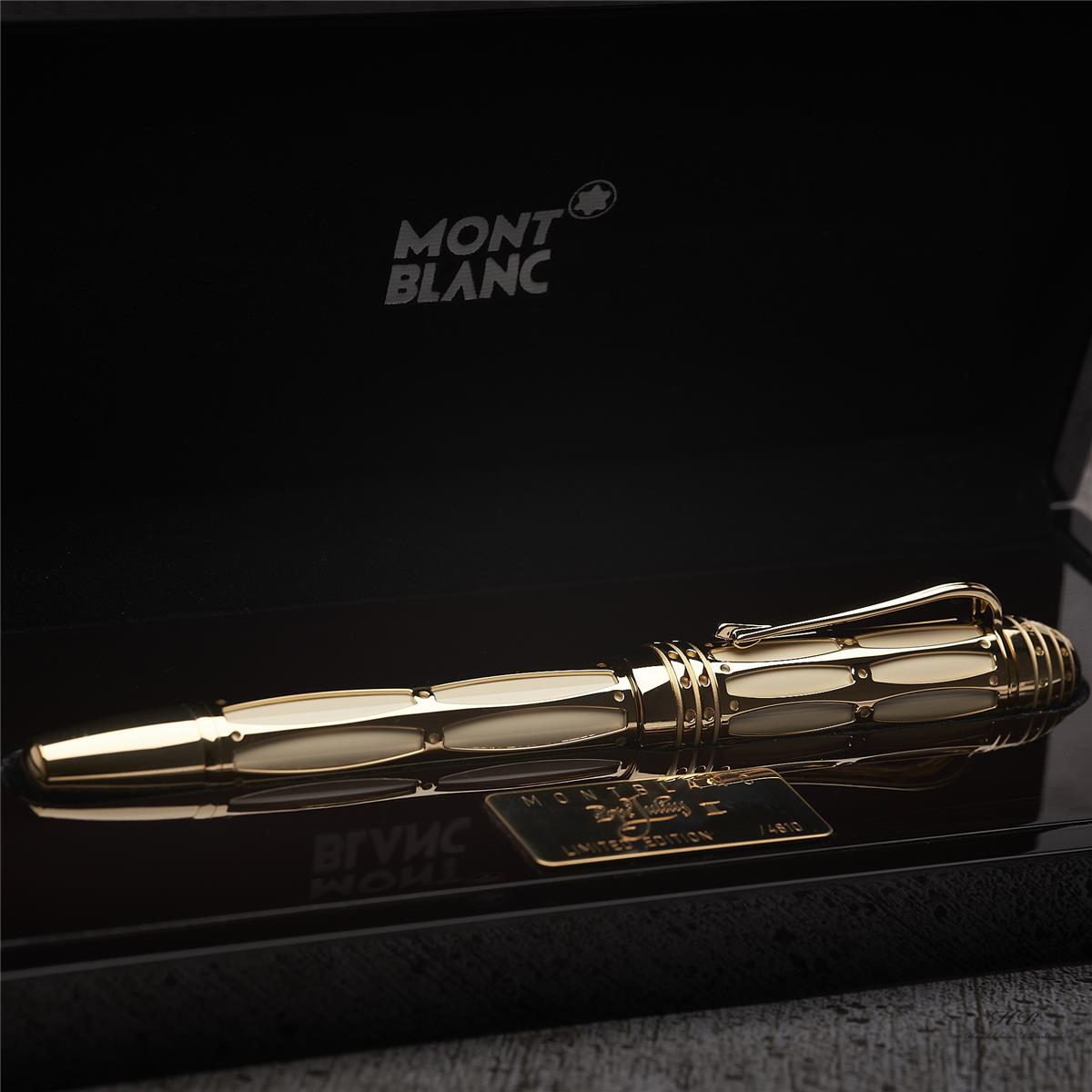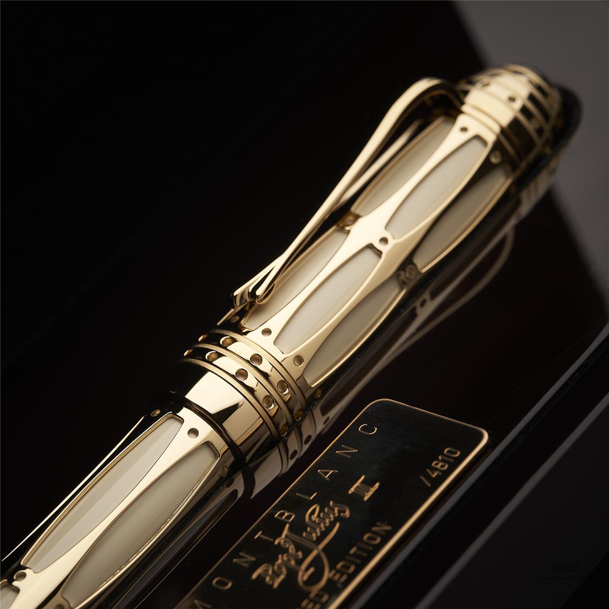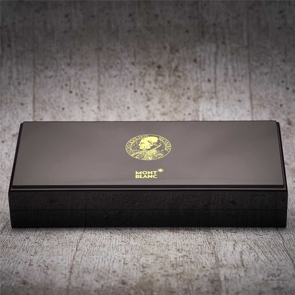 Goldener Füller liegt in offener Montblanc-Box, nah frontal fotografiert