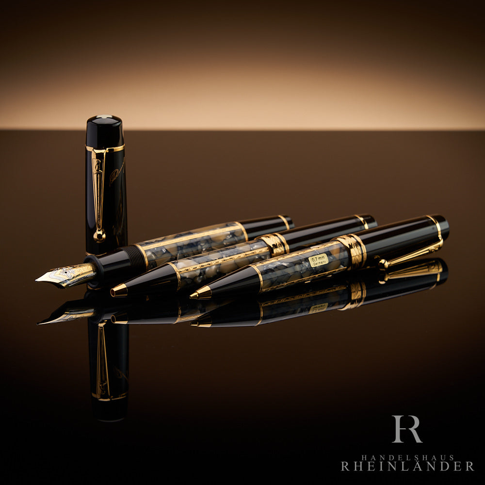 Viele Modelle setzen auf platinierte Ringe, Clips oder Kappenabschlüsse, ergänzt durch vergoldete oder massiv goldene Elemente. In Kombination mit Edelharz, mehrschichtigem Lack und Perlmutt entsteht eine Haptik, die man bei jeder Notiz spürt. Diese Materialwahl unterstreicht den Limited-Charakter und macht die Hommage an den jeweiligen Schriftsteller sichtbar und langlebig.