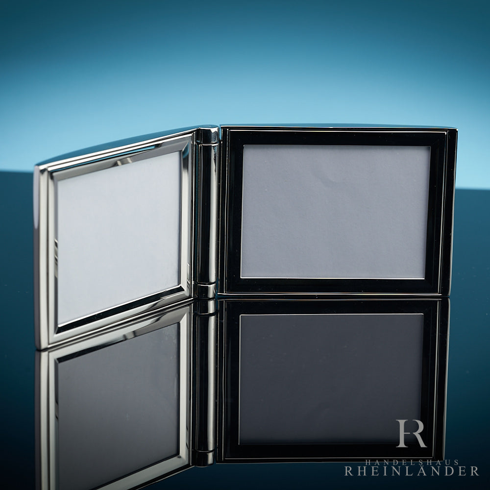 Platinierter Montblanc Bilderrahmen zusammengeklappt auf schwarzem Tisch