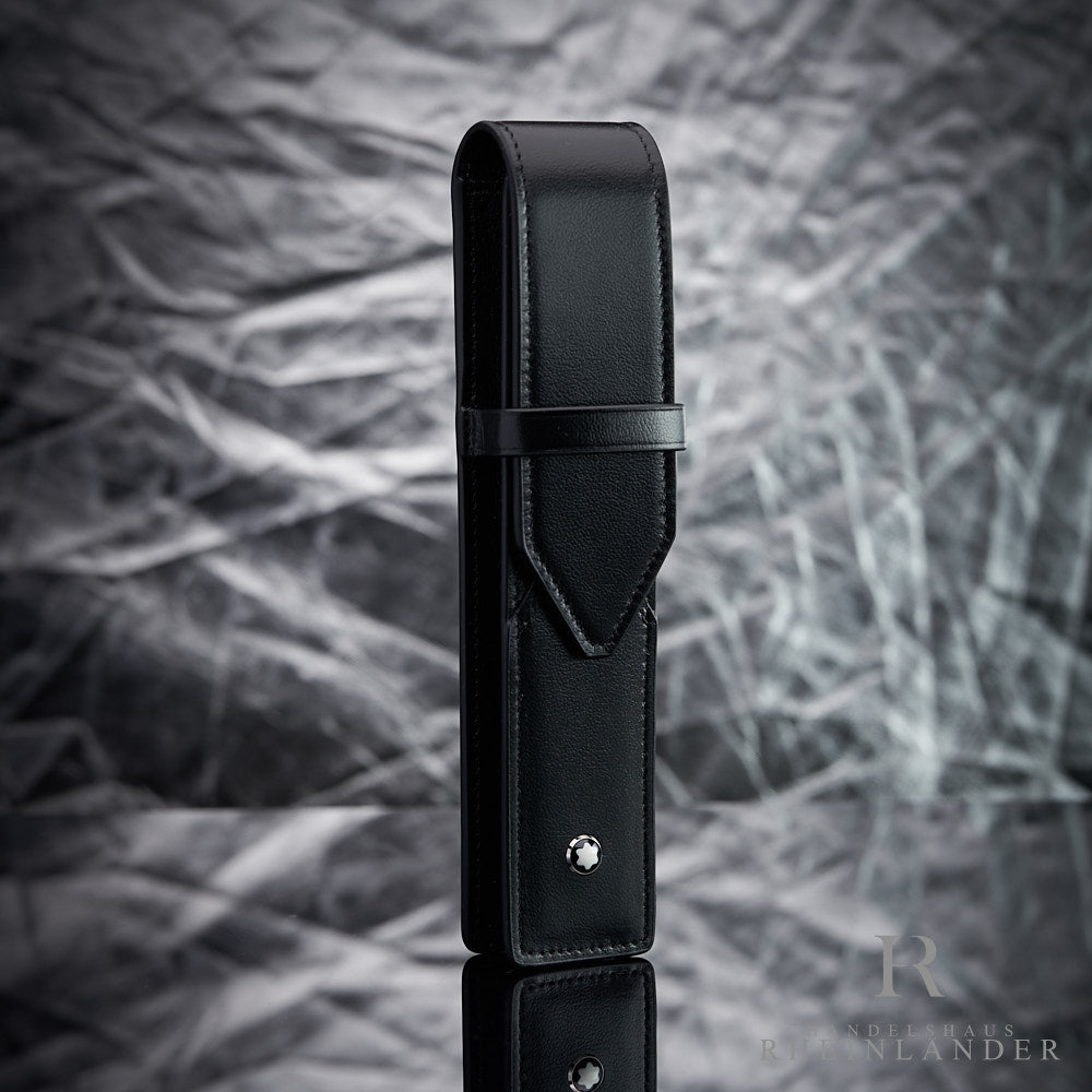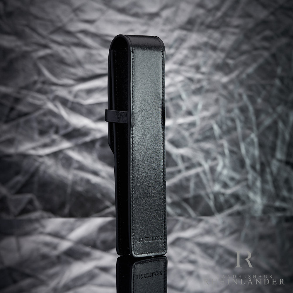 schwarzes Montblanc Lederetui geschlossen stehend vor silbernem Hintergrund