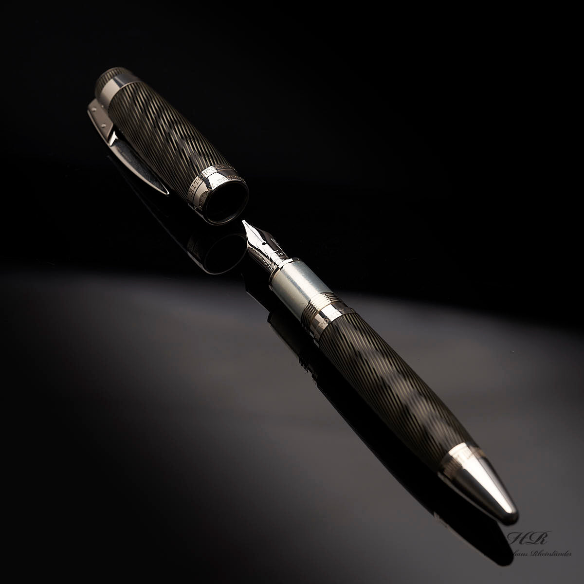 Schreibgerät und Beigabe in schwarzer, offener Originalbox liegend vor dunkelgrauem Hintergrund fotografiert