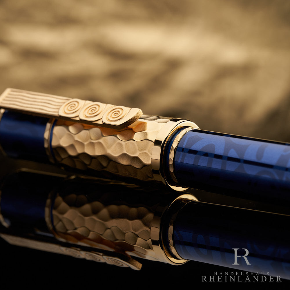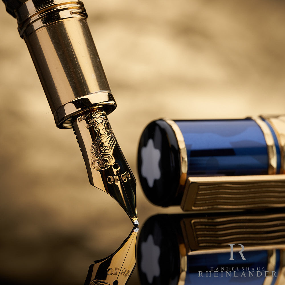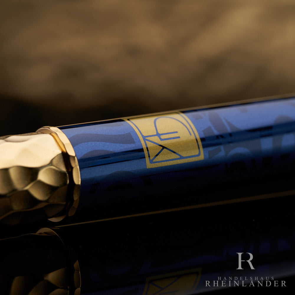 Blau-goldener Füller und Serviceguide lehnen in offener, aussen blau lackierter Originalbox vor goldenem Hintergrund