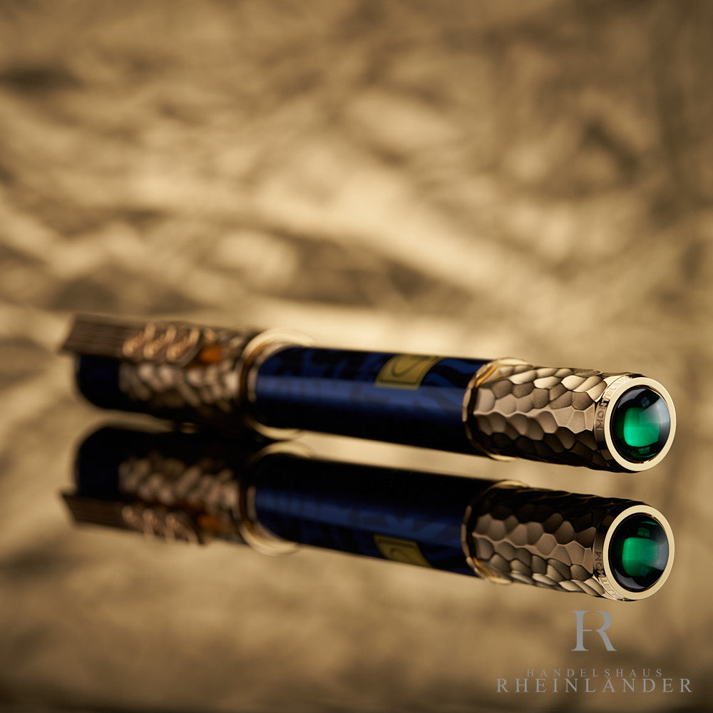 Blau-goldener Rollerball und Serviceguide lehnen in offener, aussen blau lackierter Originalbox vor goldenem Hintergrund