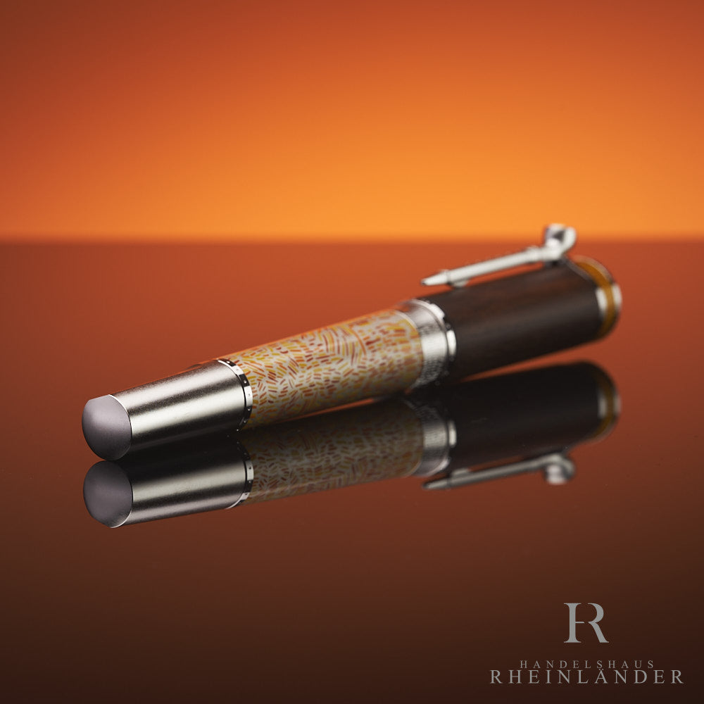Rollerball und Serviceguide lehnen in offener Originalbox vor orangenem Hintergrund