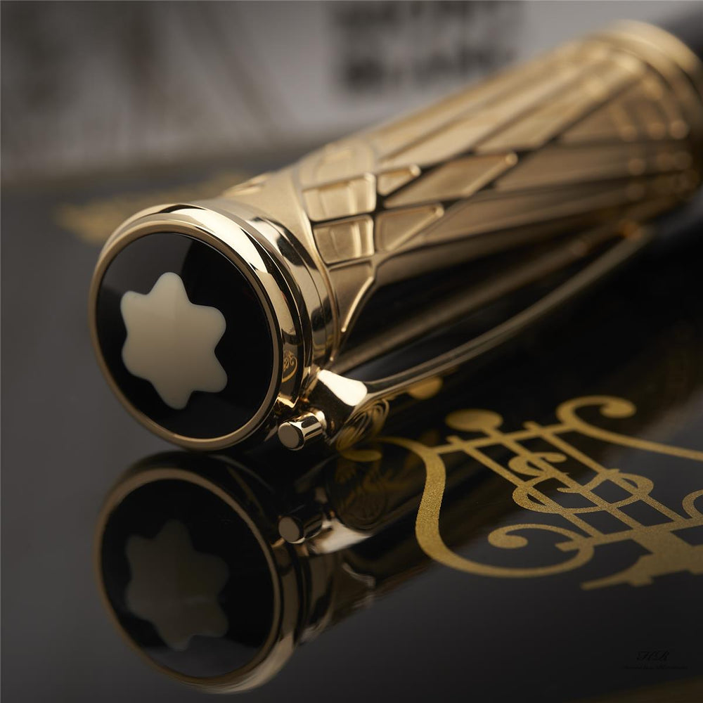 Patron of Art models combine guilloché textures, translucent lacquers, gold-plated or platinum-plated fittings, and the iconic emblem in white precious resin. Architecture, coats of arms, and quotes from the honored figure are incorporated into the clip, cap, barrel, and nib, creating a fountain pen that evokes history and design.