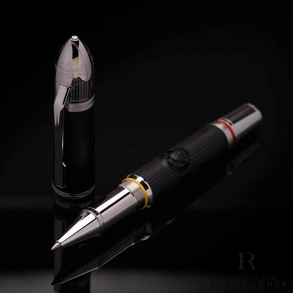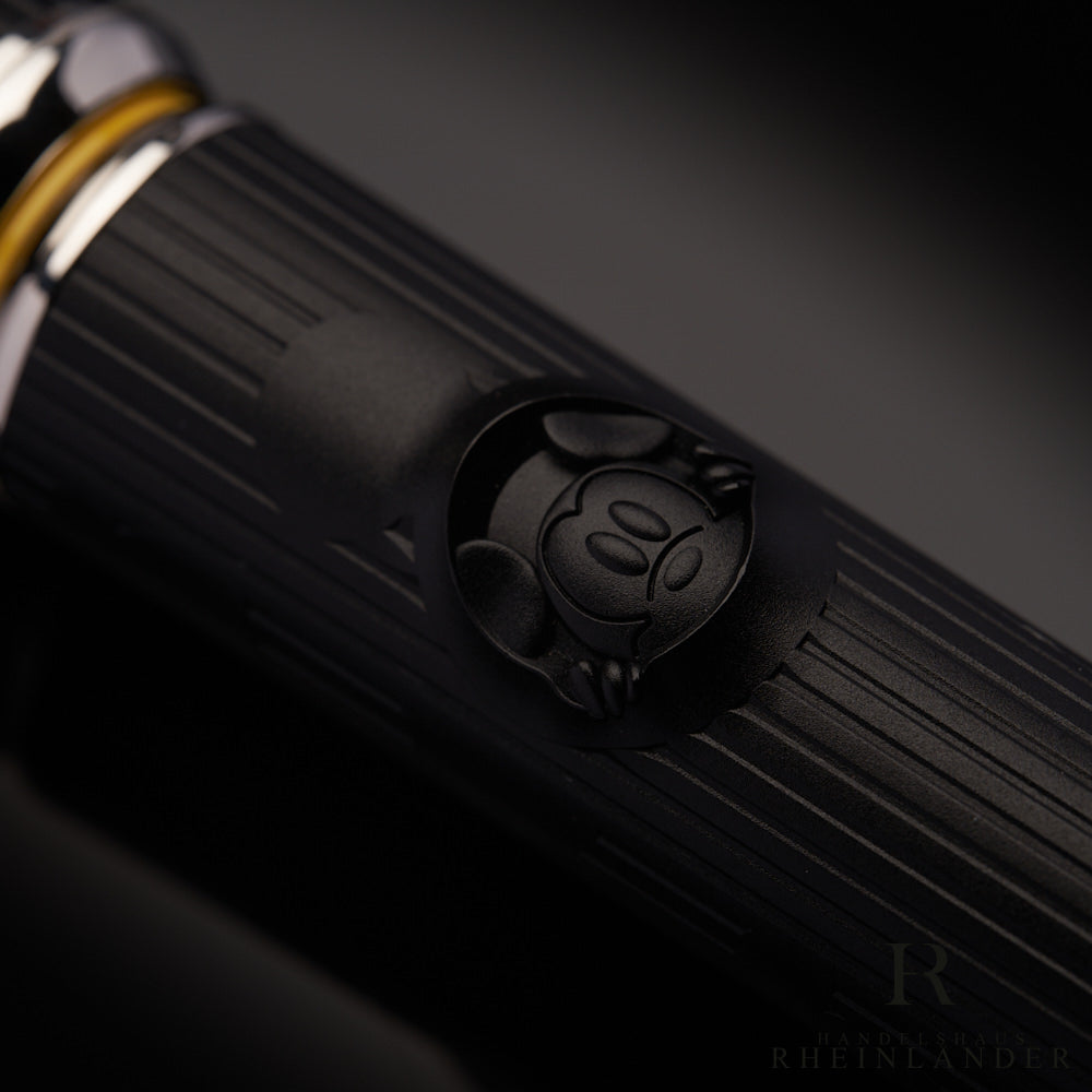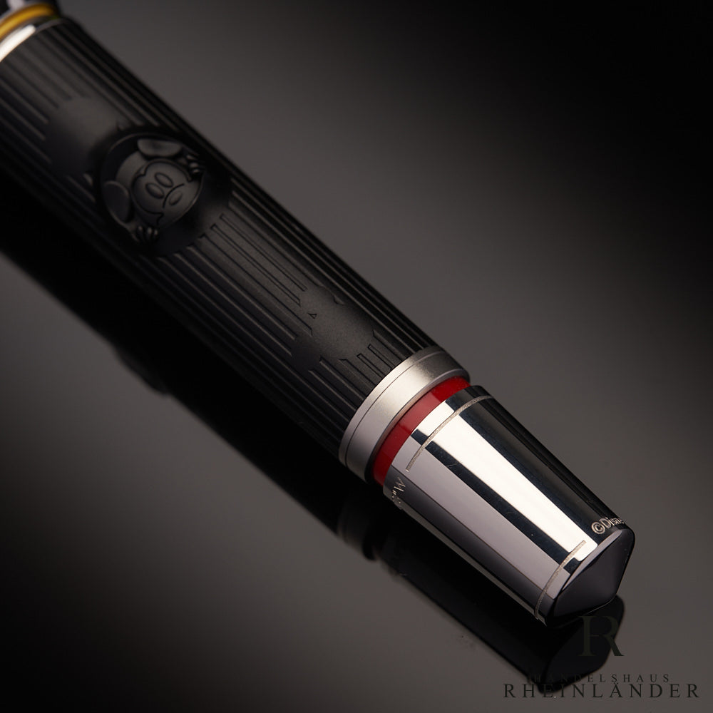 Schwarzer Rollerball liegt in offener Editionsbox. Darin aufgestellt das gelbe Disney-Serviceheft