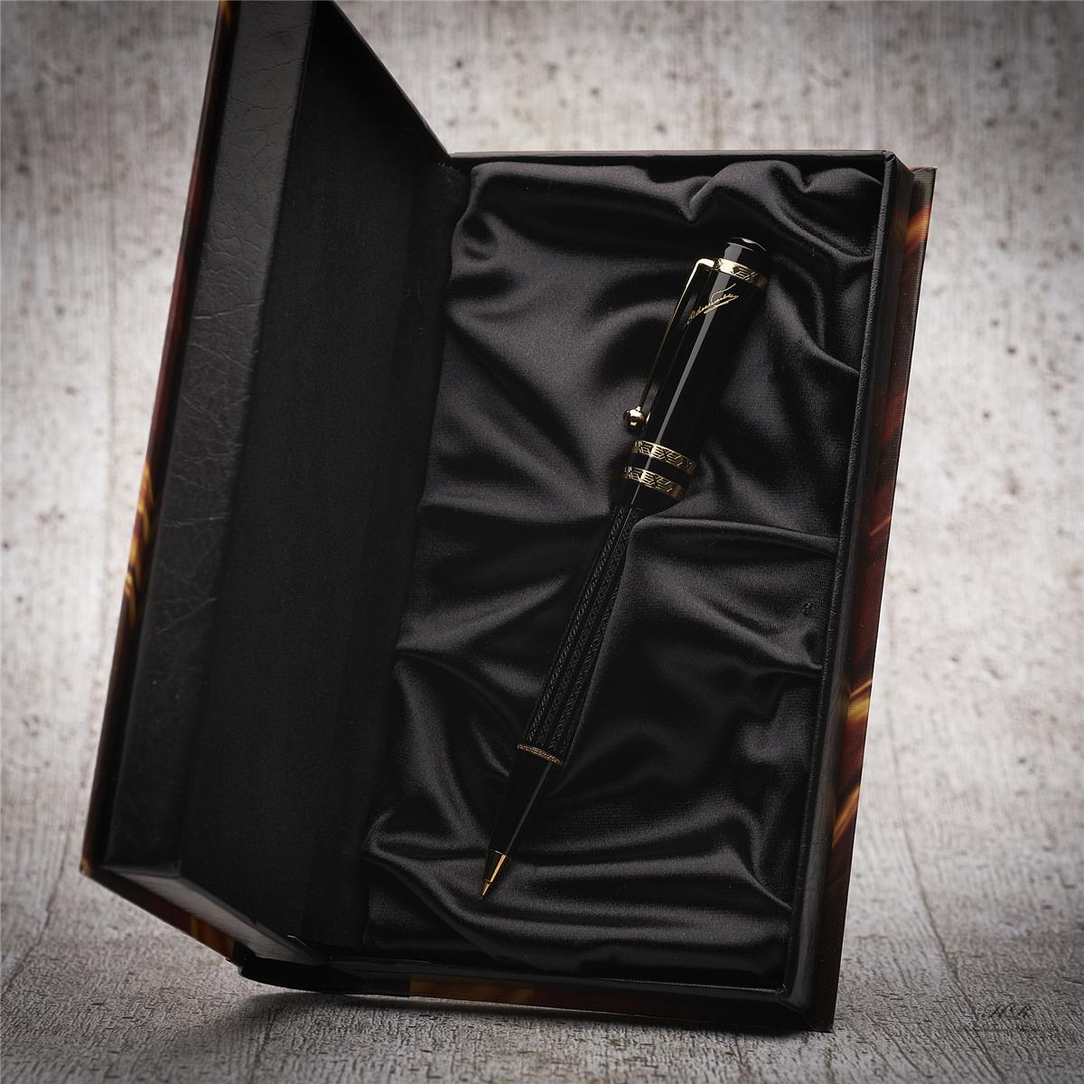 Edler, schwarzer Bleistift liegt in geöffneter original Buchbox, halb aufgestellt vor hellgrauem Holzoptik-Hintergrund