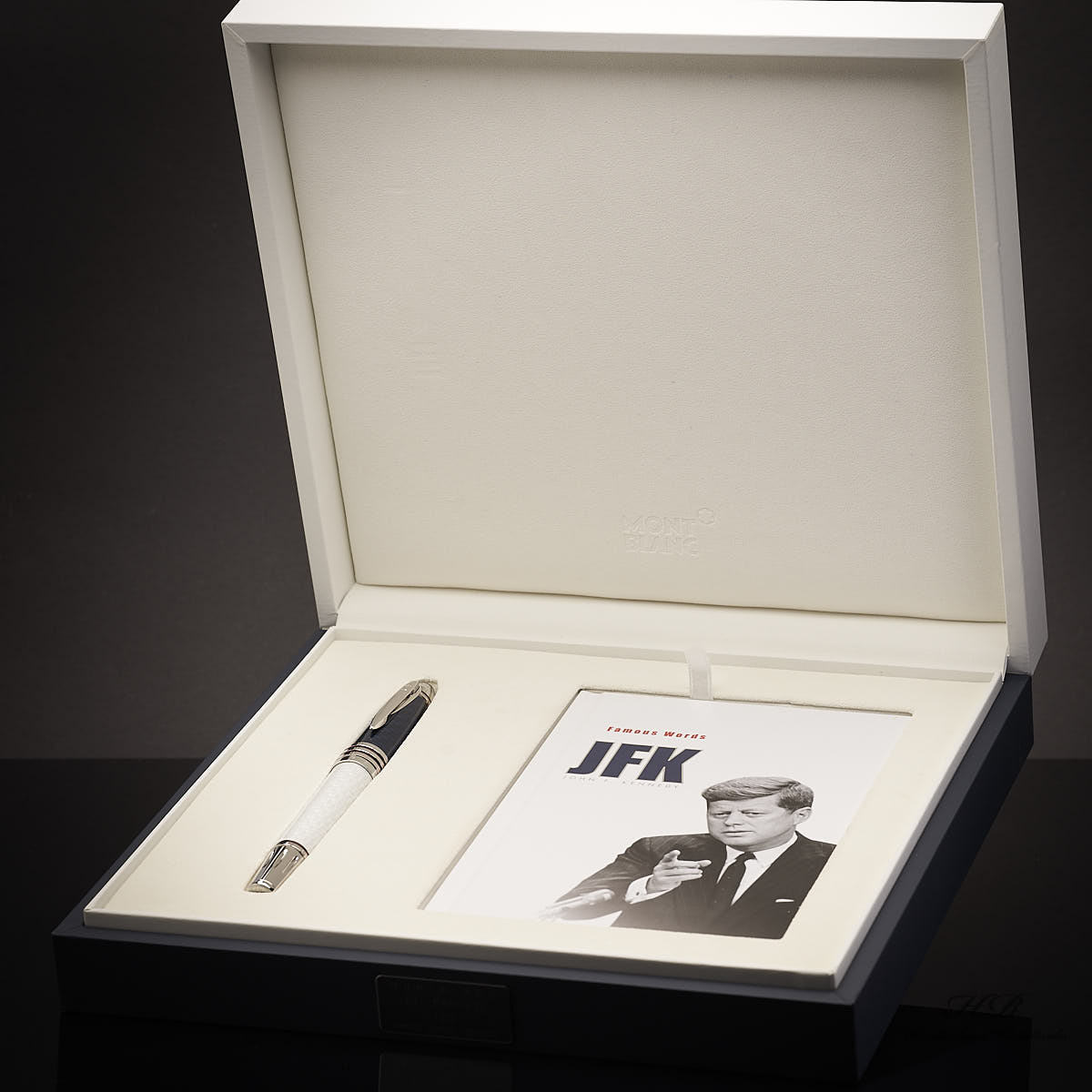 Weisser Füller zusammen mit Ghandi-Serviceheft in offener, weisser Editionsbox vor dunkelgrauem Hintergrund