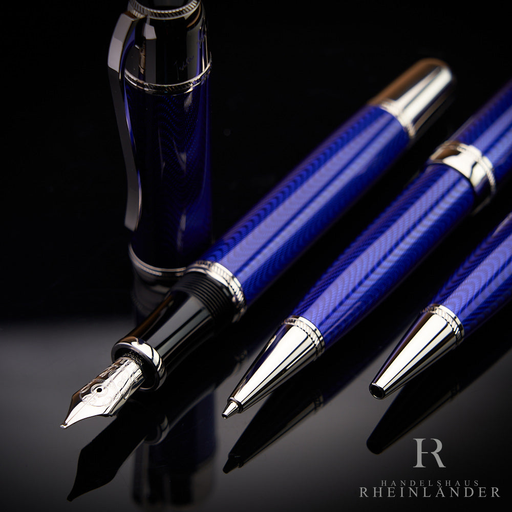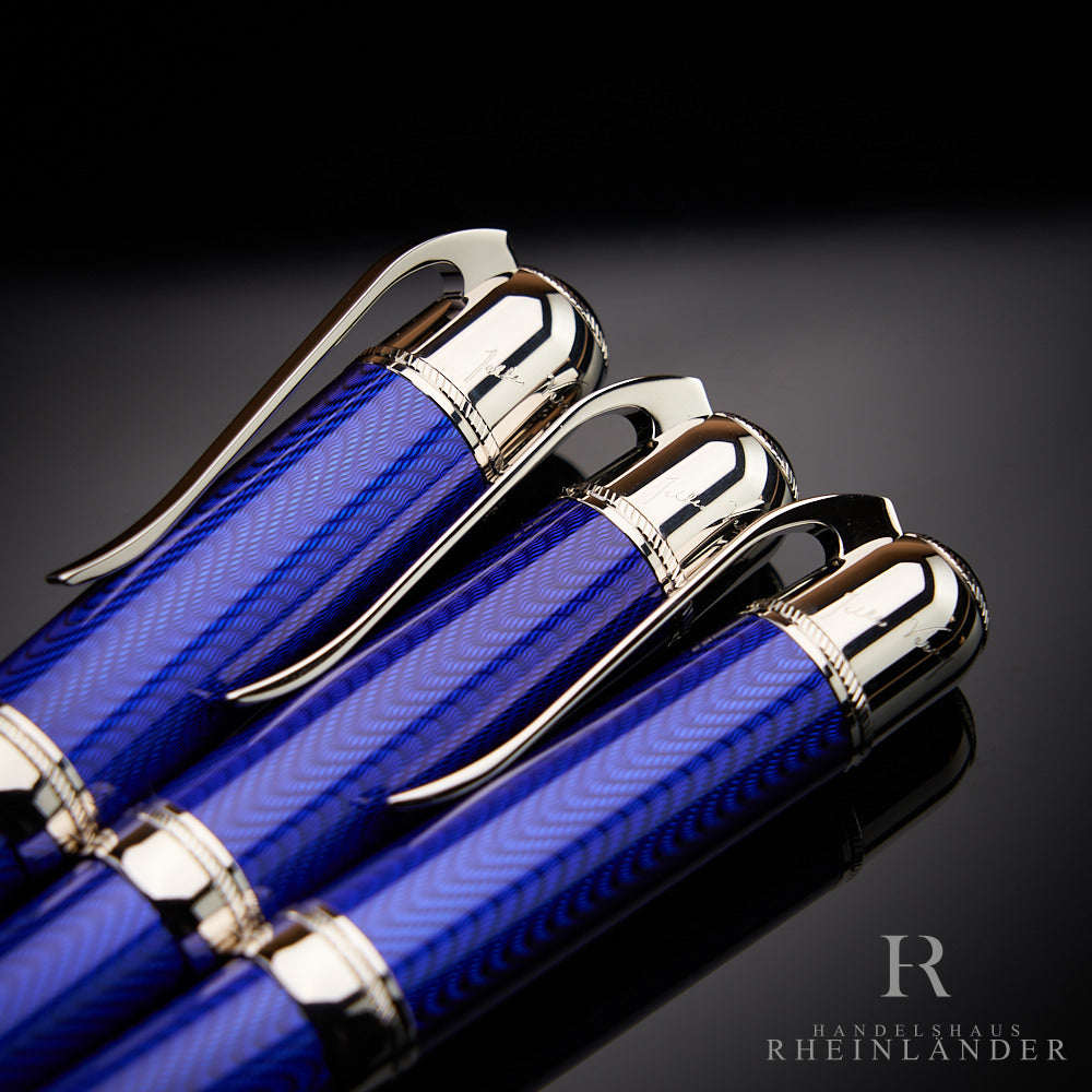 - Besonderheit: Korpus wird von einer Guilloche aus gleichmäßigen Wellen umspielt | Blaue Farbe des Korpus ist leuchtend