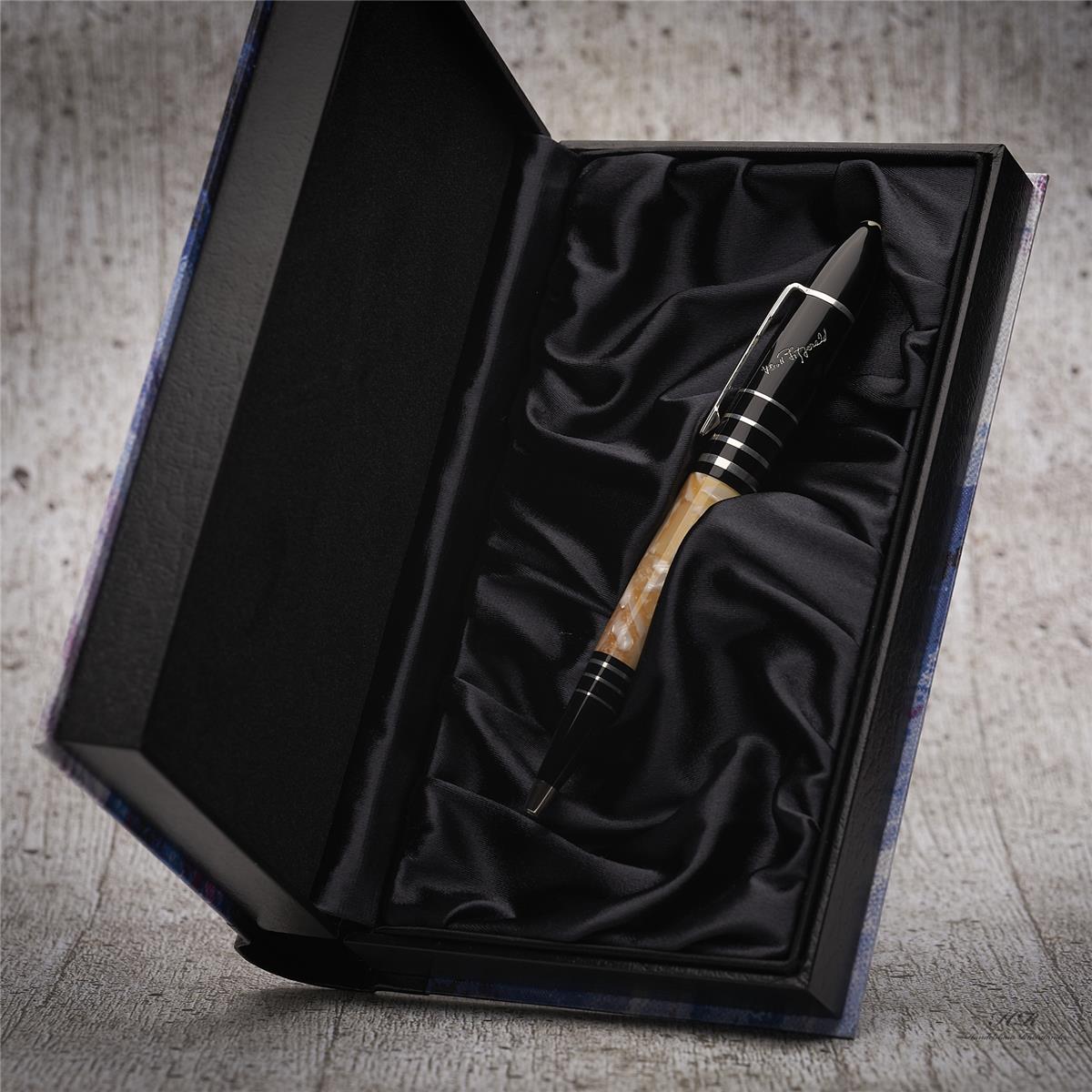 Edler Kugelschreiber liegt in offener, halb aufgestellter Buchbox vor hellgrauem Holzoptik-Hintergrund